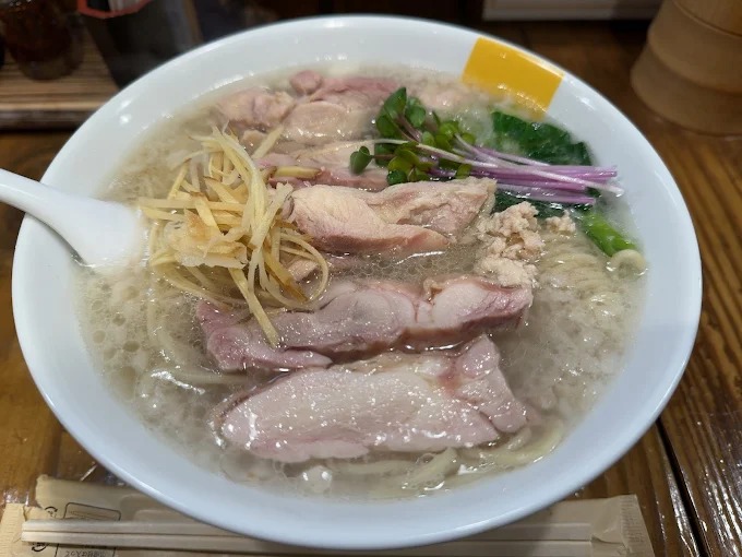 A healing bowl of salt‑ginger ramen featuring a golden broth where ginger shines, paired with chewy thick noodles.